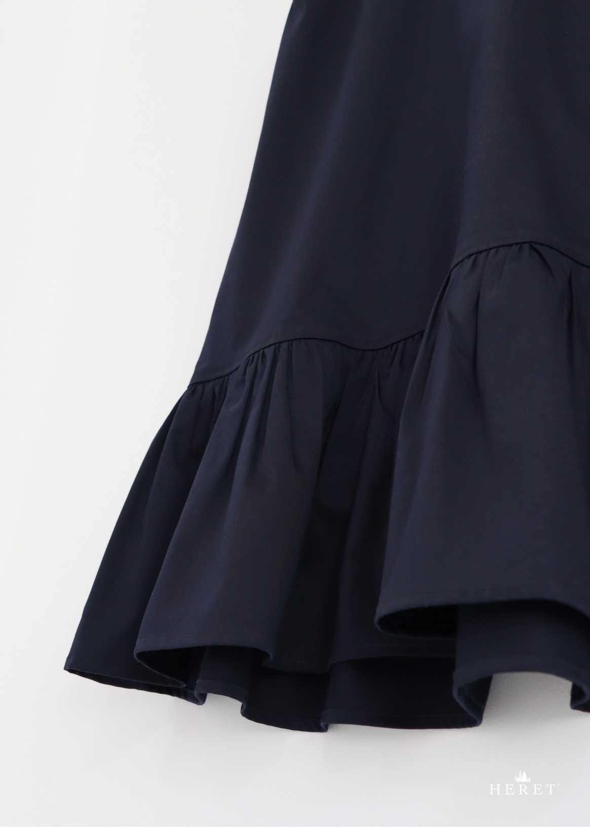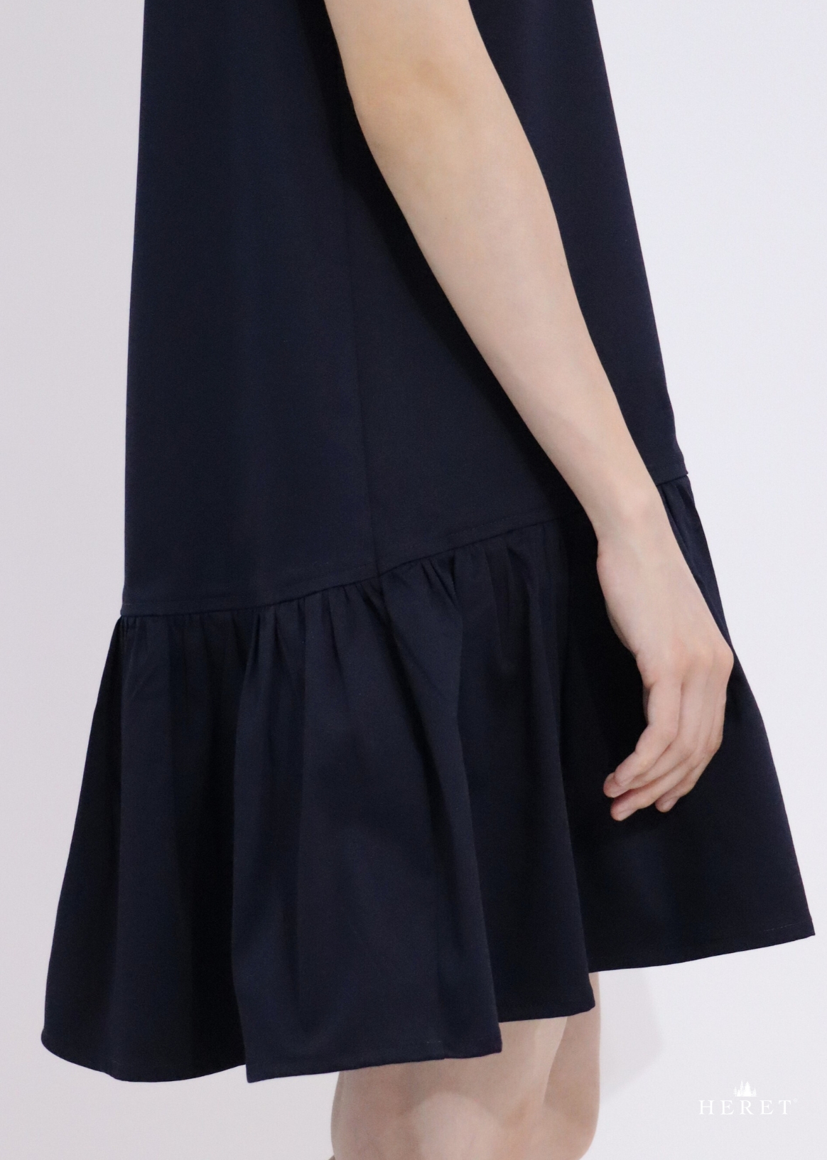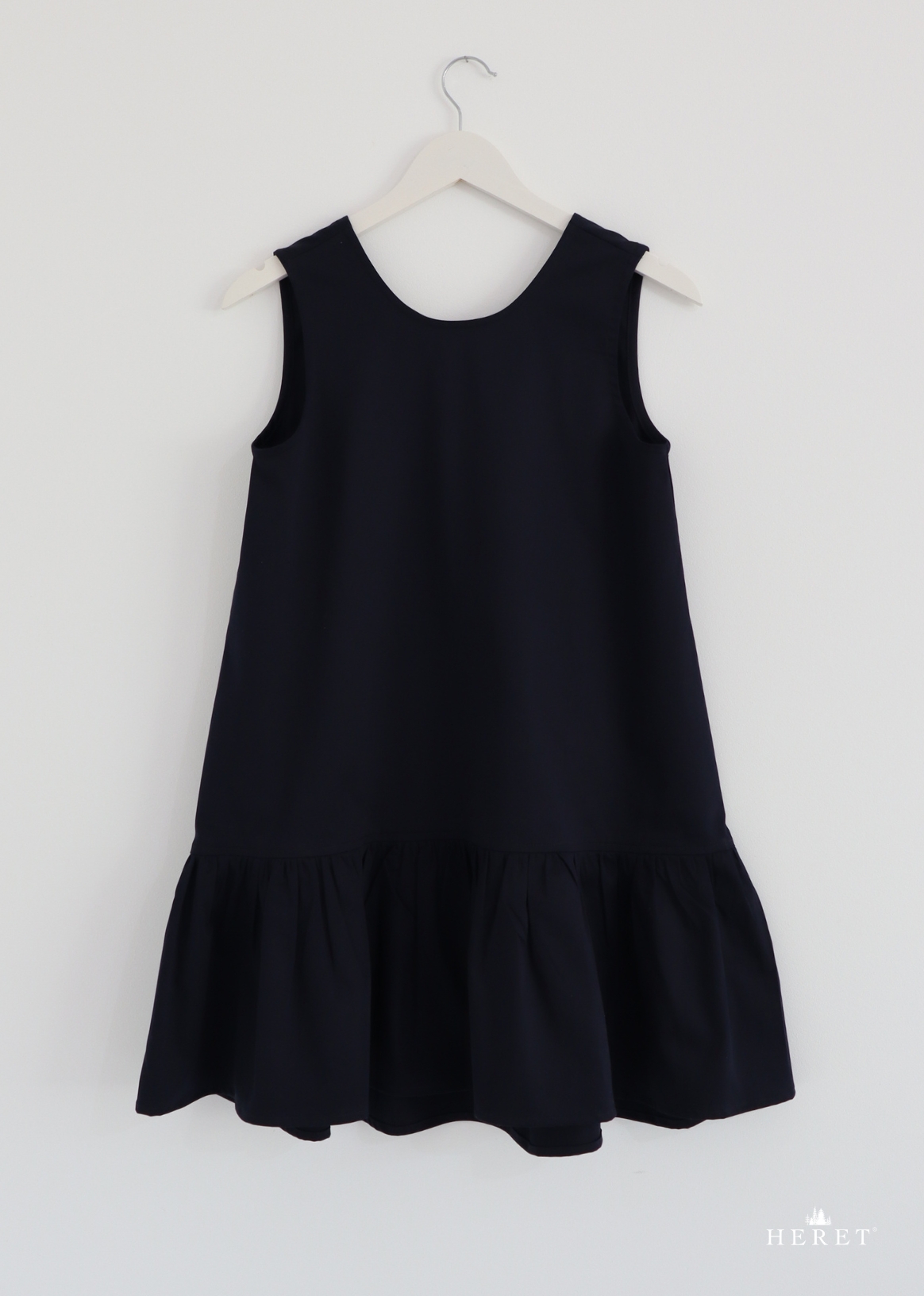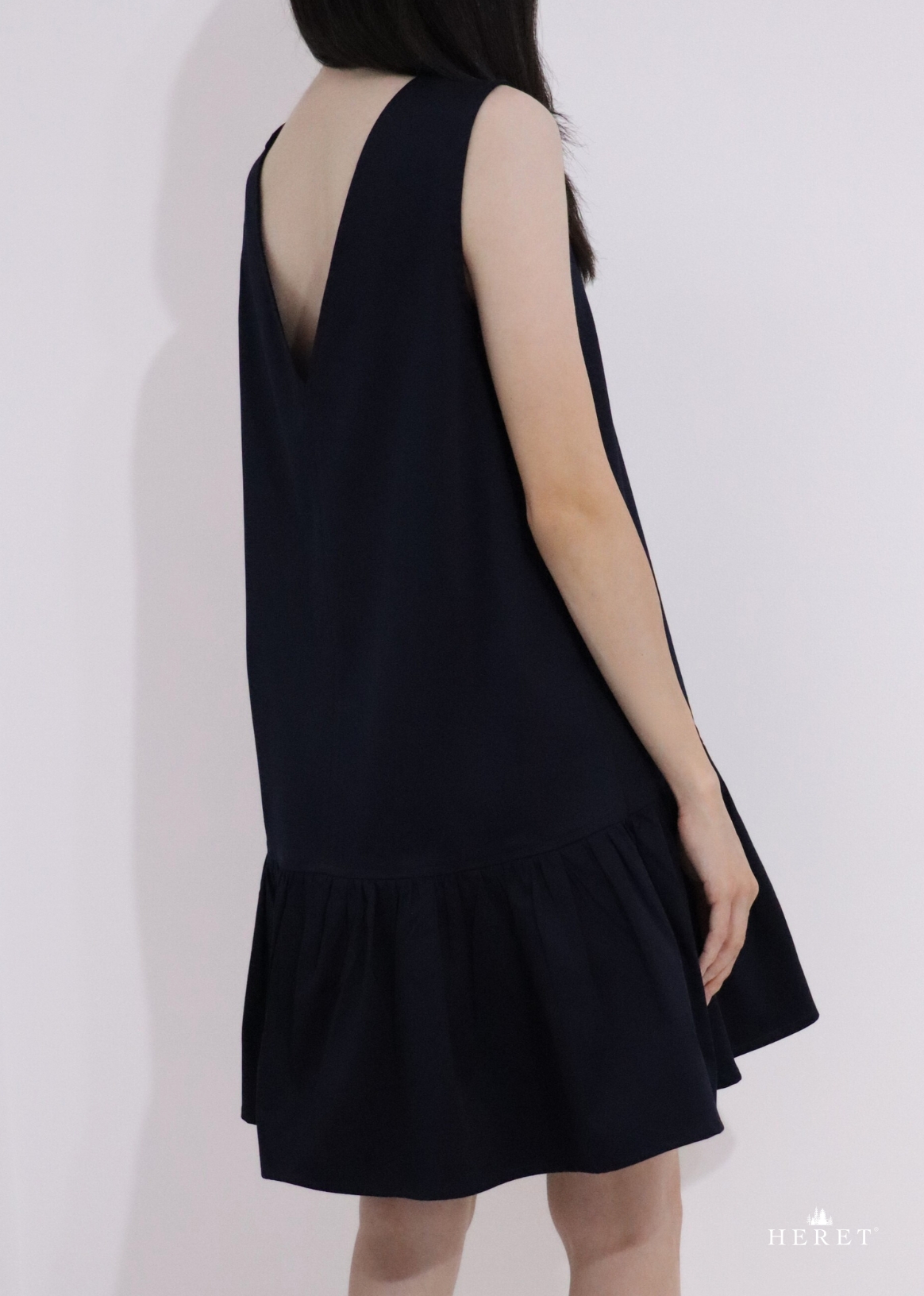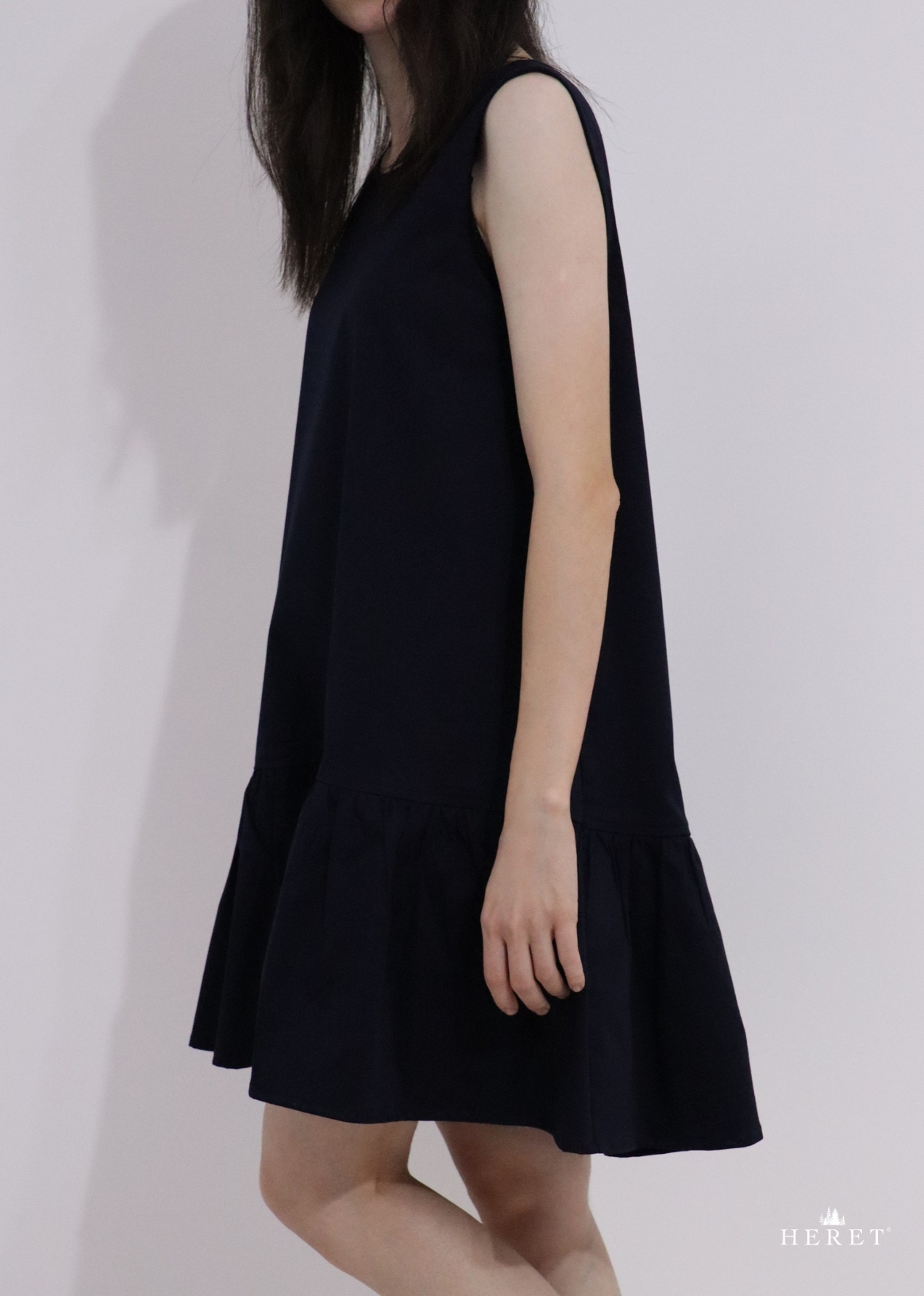 This sleeveless dark blue A-line dress is crafted from a soft cotton-elastane blend for comfort and a flattering fit. Featuring a chic V-back, medium-short length, and a delicately gathered ruffled hem, it’s perfect for both casual days and elegant evenings.